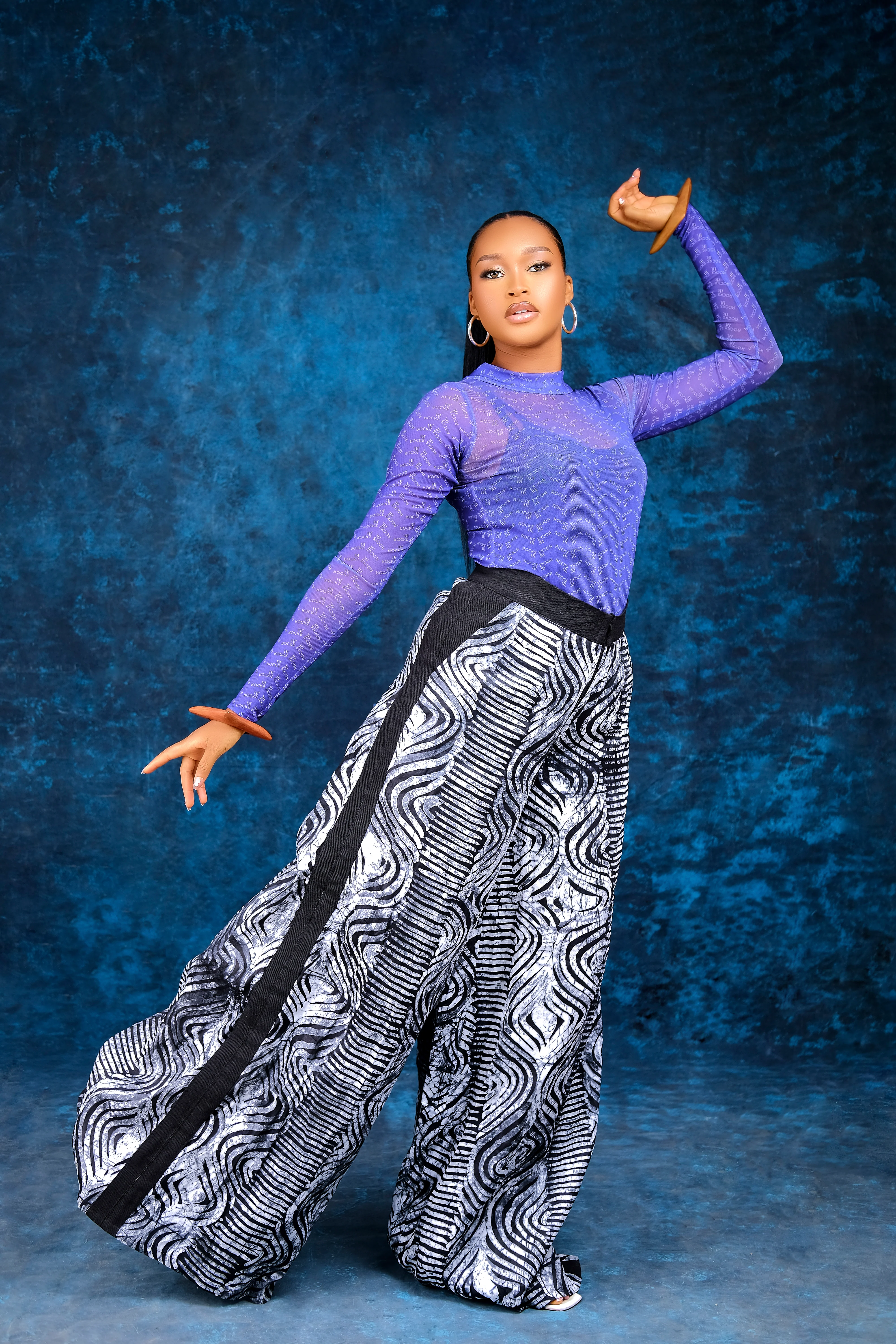 Indulge in the luxurious allure of the modupeola Adire cullotte set. Made with a custom digital print tulle net body con top, paired with hand dyed batik and aso oke cullotte pants, this set exudes elegance and sophistication. Perfect for those seeking a unique and stylish ensemble.