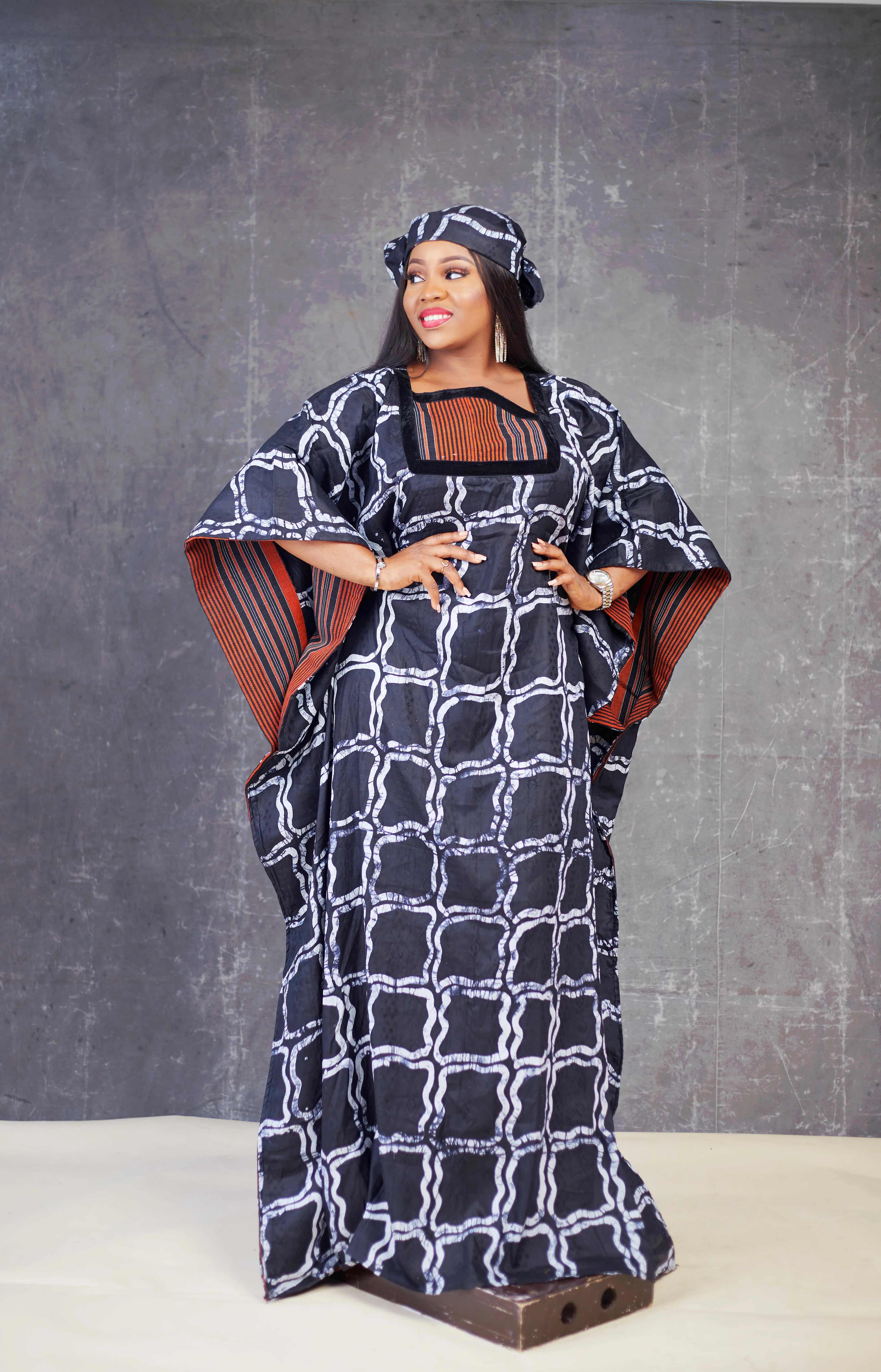 - Velvet and aso oke details on the neckline