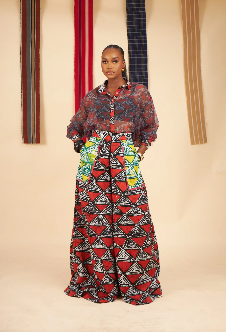 This exquisite long sleeve organza shirt features a stunning digital print inspired by adire fabric. It effortlessly complements any outfit, whether dressed up with a pair of jeans for a casual weekend look or paired with cropped pants for a sophisticated touch.