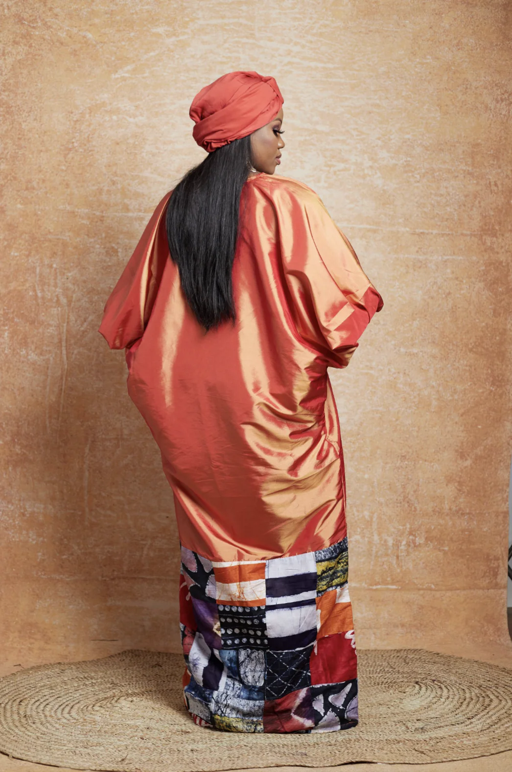 Boubous are so in! Easy wear that can be dressed up for more traditional dates. Sultry silhouette, this long flowing number is a real classic. The patchwork of adire to the taffeta makes it more unique. (no two patchwork is exactly the same)