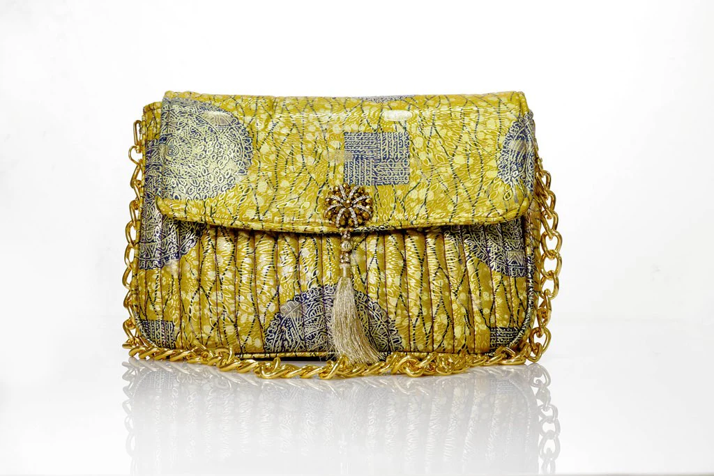 Large size envelope clutch with tassel trim.