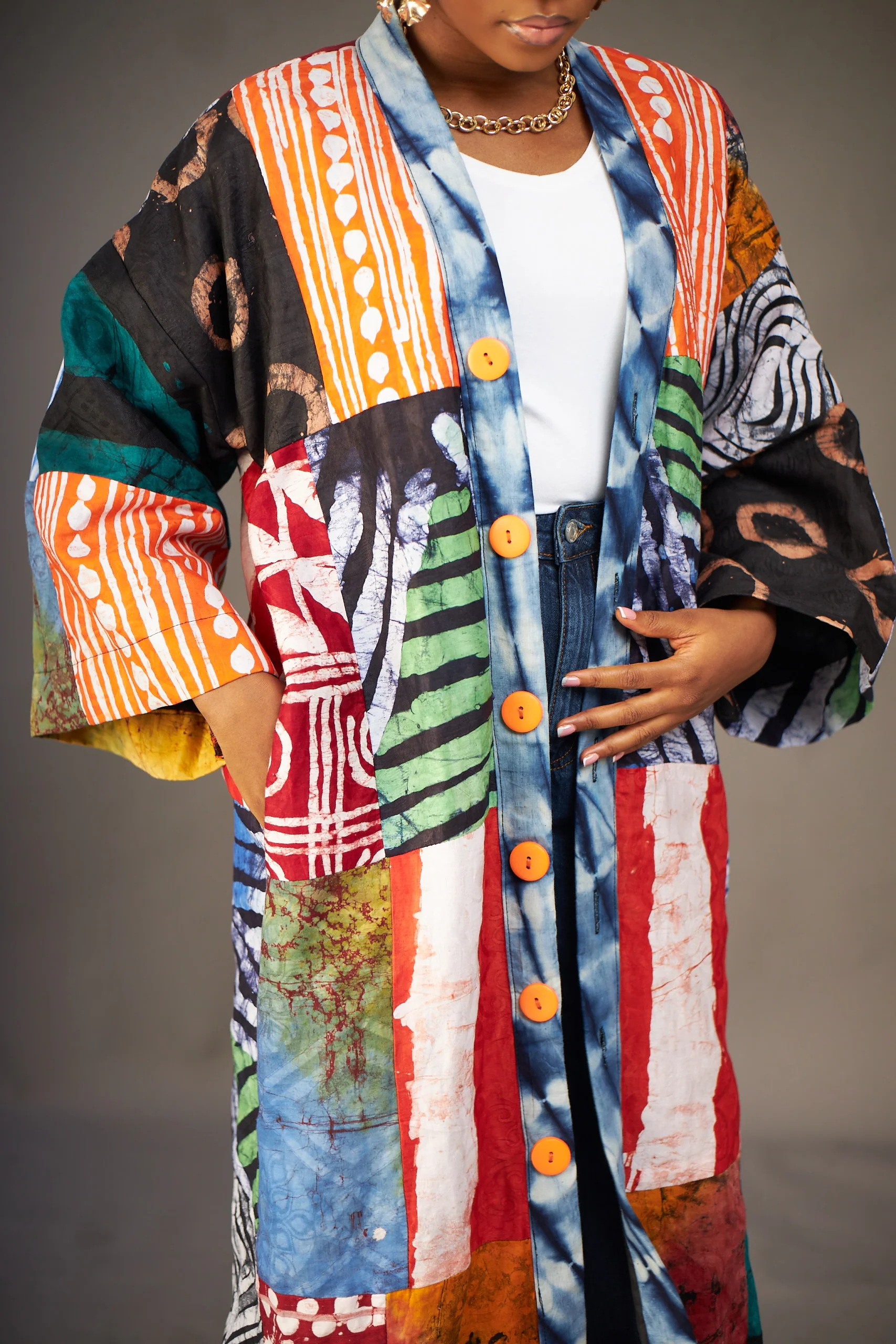 Make a statement in this vibrant patchwork tunic dress — a true wardrobe multitasker. Wear it buttoned down as a striking maxi dress or style it open over jeans as a kimono jacket. Either way, it’s a bold celebration of African prints and modern versatility.