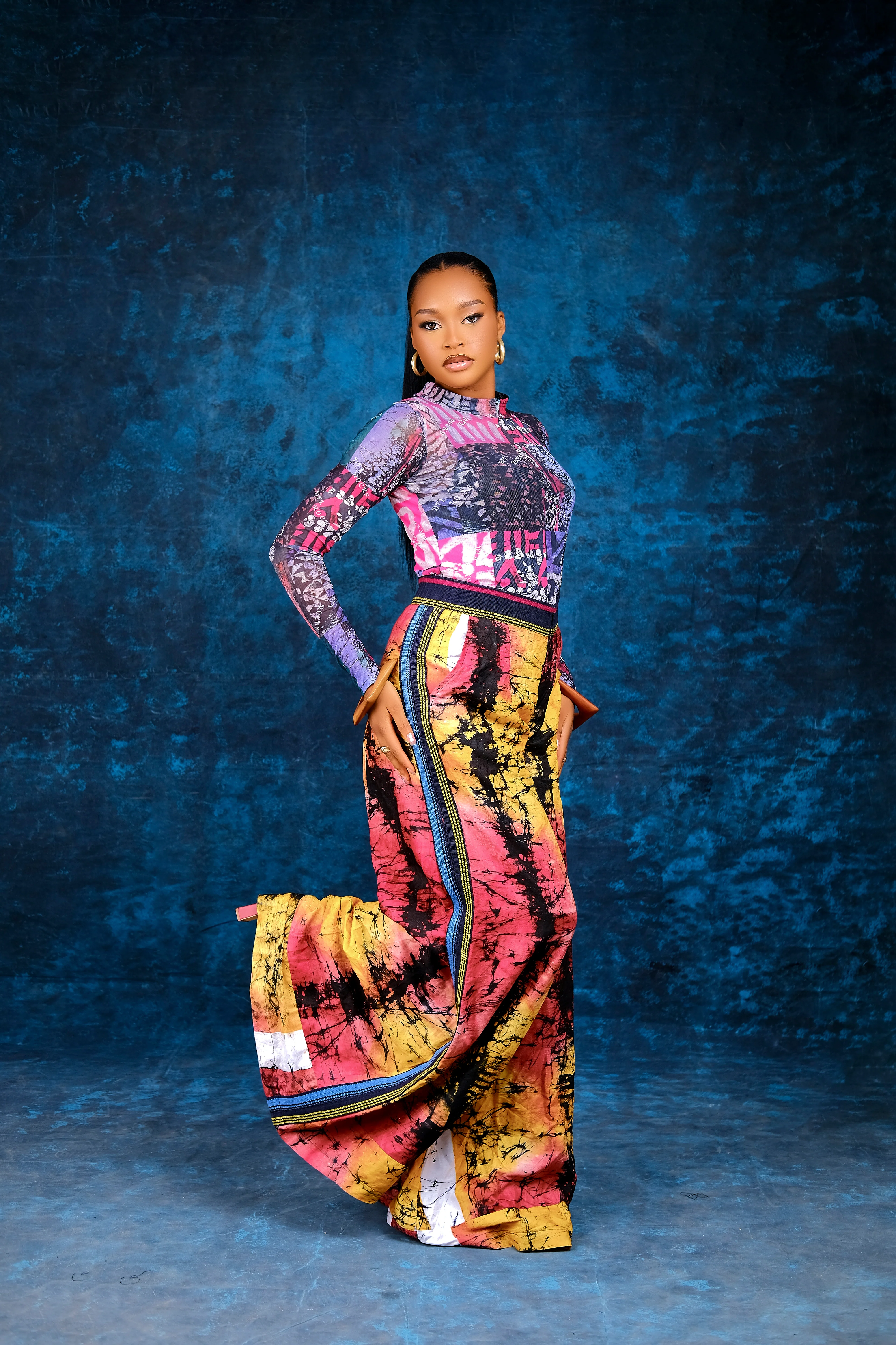 Indulge in the luxurious allure of the Peju Adire cullotte set. Made with a custom digital print tulle net body con top, paired with hand dyed batik and aso oke cullotte pants, this set exudes elegance and sophistication. Perfect for those seeking a unique and stylish ensemble.
