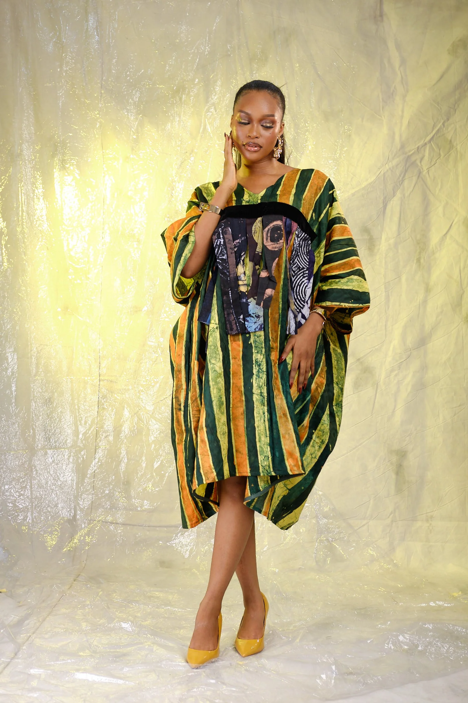 weekends are made for chilling and hanging out with friends. This tassel adire boubou with a contemporary twist: V- neck line and a contrasting patch pocket would makes a good transition outfit whether with sneakers or with heels.