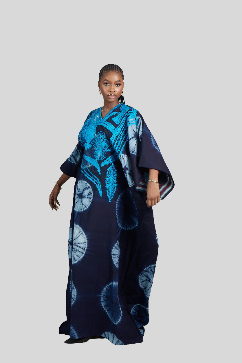 Where North meets South, tradition meets modern elegance. This loose, flowy boubou is a masterpiece of cultural fusion—crafted from hand-dyed fabric, colored in the ancient dye pits of Kano, and adorned with the richness of aso-oke from Western Nigeria. Intricate embroidery weaves the story of heritage into every stitch, making this piece more than just fashion—it’s history in motion.